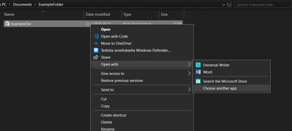 Attention! If you have done this before then there is no need for this. In this picture we see couple of choices. Firstly we have to right click a file what we want to open. If you want open it only once in Universal Writer then click ”Open with” and ”Universal Writer”. If you would like to open file next time only clicking it once then choose ”Open with” and ”Choose another app”.