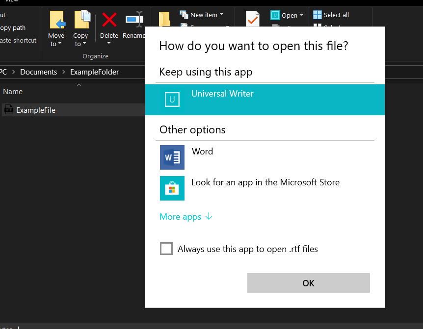 Here you select Universal Writer and click ”Always use this app to open (file type) files”. Now you should have Universal Writer selected and checkbox checked then press ”OK”. Now you should be able to open your file only clicking it once. So next time you don’t have to make same process with same file type.