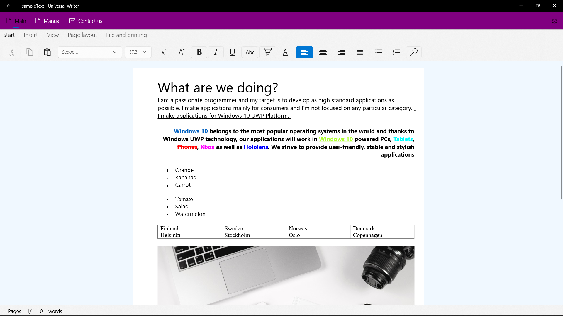 You can create docx, doc, htm, html, rtf files that allow you to edit richer text or just a simple txt file. The app has all the most common text editing tools and we support 28 different fonts. The application contains a free manual. You can add pictures, tables, hyperlinks and comments.